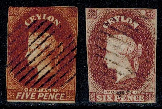 CEYLON - TWO EARLY USED SG #5 and #6a (or 6c)?. The first has 3 small margins and is cut into at top. The second has 3 small margins and just cut into at left side. The first SG catalogue value: 150 GBP, the second has SG catalogue value: 550 GBP (or 1500 GBP if shade) (Image)