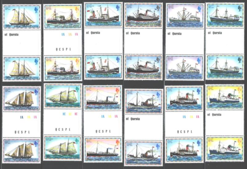 FALKLAND ISLANDS-266-274a VFNH The 1978 Ships issue as well as the "1982" inscribed year varieties in complete sets of gutter pairs (Image)