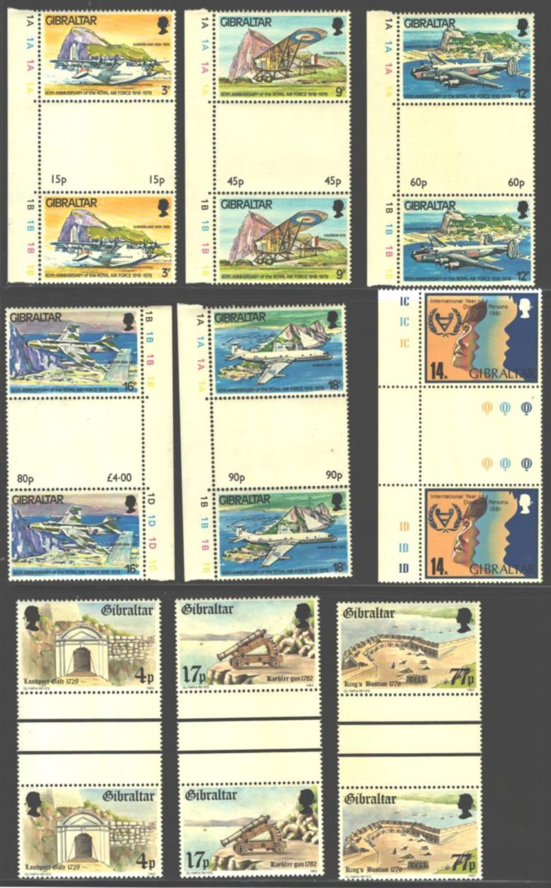 GIBRALTER-485/542 GUTTER PAIRS VFNH Selection of 29 different gutter pairs from the years 1985 to 1988. Almost all are in complete sets. See scan for list (Image)