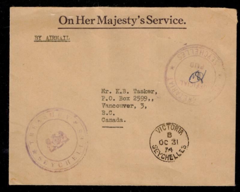 VICTORIA SEYCHELLES COVER On Her Majesty's Service, dated 1914. Seychelles government Treasury seal (Image)
