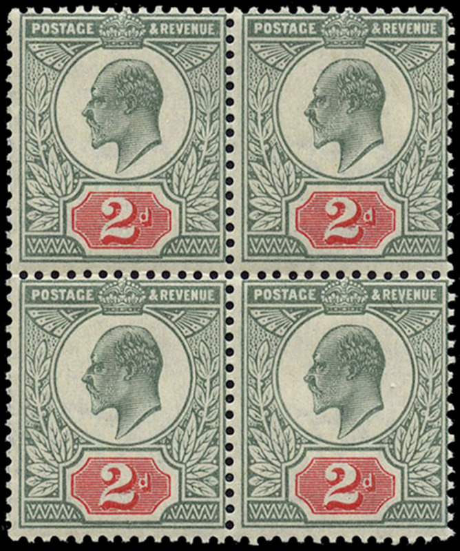 GREAT BRITAIN: 130: 2d yellow green and red, block of four, og, fresh and fine. (Image)