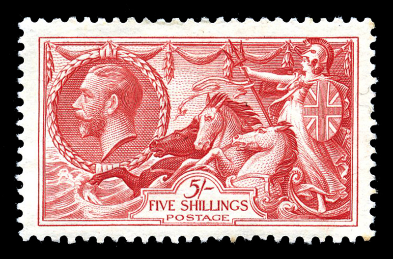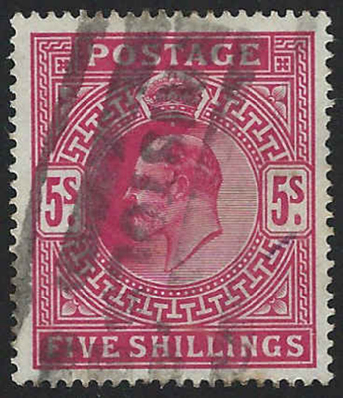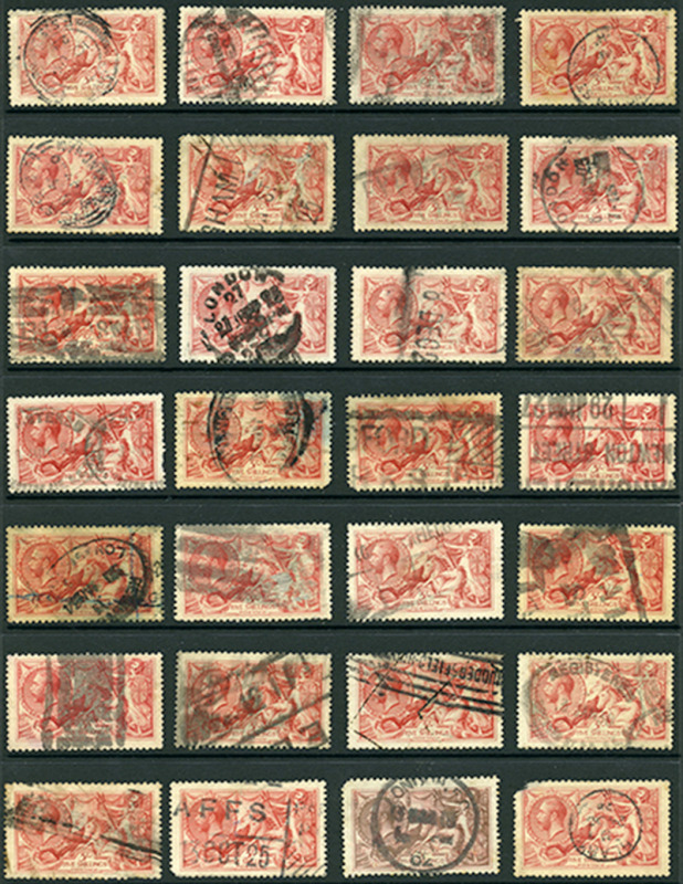 GREAT BRITAIN: 180,etc: 5/- carmine rose Seahorses, 28 copies, with shades, etc, some faults, plus three with perfins and four obviously faulty not included in totals, appear mostly f-vf (Image)