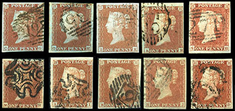 GREAT BRITAIN: 3,3f: ONE PENNY, Red brown, on blue paper, TEN COPIES with varying degrees of blue colour, various cancels incl two with black MC, attractive group, mostly four margin f-vf copies. (SG 8, 8a, 8l, - £410) (Image)