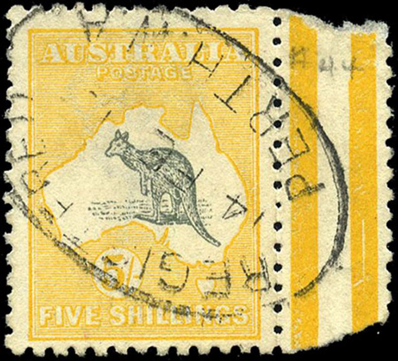 AUSTRALIA: 44: 5/- yellow & grey, used with almost cpl oval Perth registration cancel, right margin copy, attractive and almost very fine (Image)