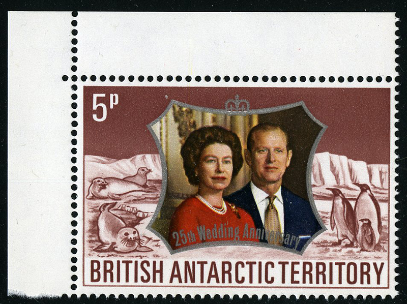 BRITISH ANTARCTIC TERRITORY: 43var: 5d Silver Wedding in top right corner margin single with INVERTED WATERMARK, og, never hinged, vf. (Image)
