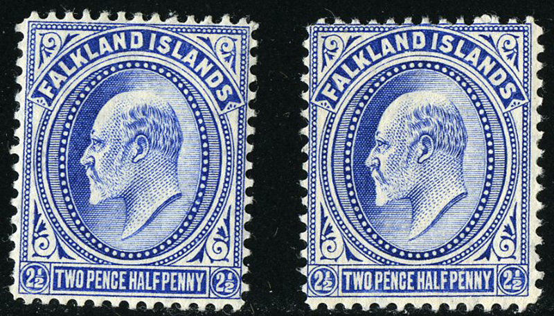 FALKLAND ISLANDS: 25,25var: 2½d Edward in two different shades of ultramarine, both with og, hr, fine. (SG 46, 46var - £60+) (Image)