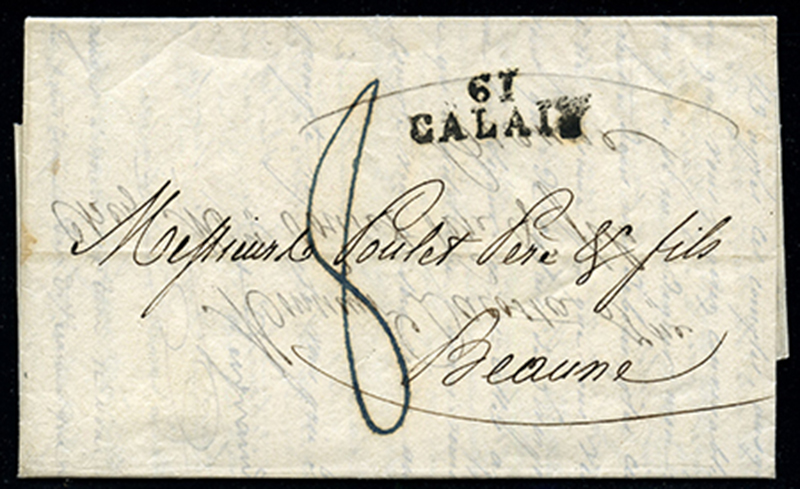 GREAT BRITAIN: 1827 Folded letter written at London 27 NO 1827 to Beaune, France, carried privately to Calais with very fine strike of FORWARDING AGENT Ns. MORY, ACHEMINEE DE CALAIS, PAR VOTRE DEVOUE SERVITEUR oval handstamp on back, placed in the mails and marked manuscript ‘8’ (decimes due) and straight line ‘61 CALAIS’ on front, choice and very fine. (Image)