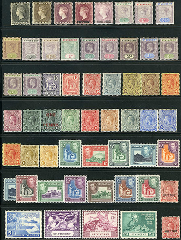 SAINT VINCENT: 13/173: 56 different, 1871 to 1949, quality mixed in early, some ng, includes shades, perfs, War Tax, all appear fresh, attractive and most f-vf. (Image)