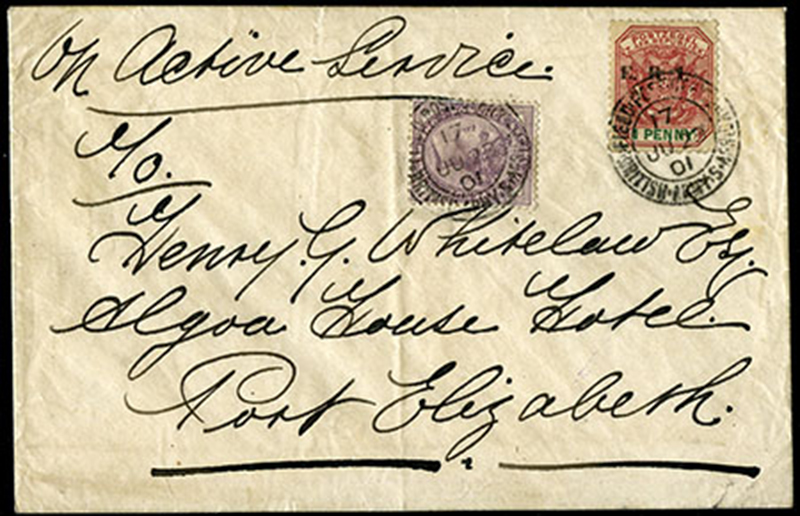 BOER WAR COVERS: Great Britain 89; Transvaal 248: Great Britain 1d lilac and Transvaal 1d rose and green, both tied by FIELD POST OFFICE/BRITISH ARMY S. AFRICA 28 JU 01 cds cancels to cover from TRANSVAAL to Cape Colony, manuscript "on Active Service?, rare oval “PASSED BY CENSOR/JOHANNESBURG/28 JUN/V FERGUSON, Capt.” censor handstamp, JOHANNESBURG transit and PORT ELIZABETH receiver, all on reverse, vertical filing crease not affecting stamps, otherwise very fine. (Image)