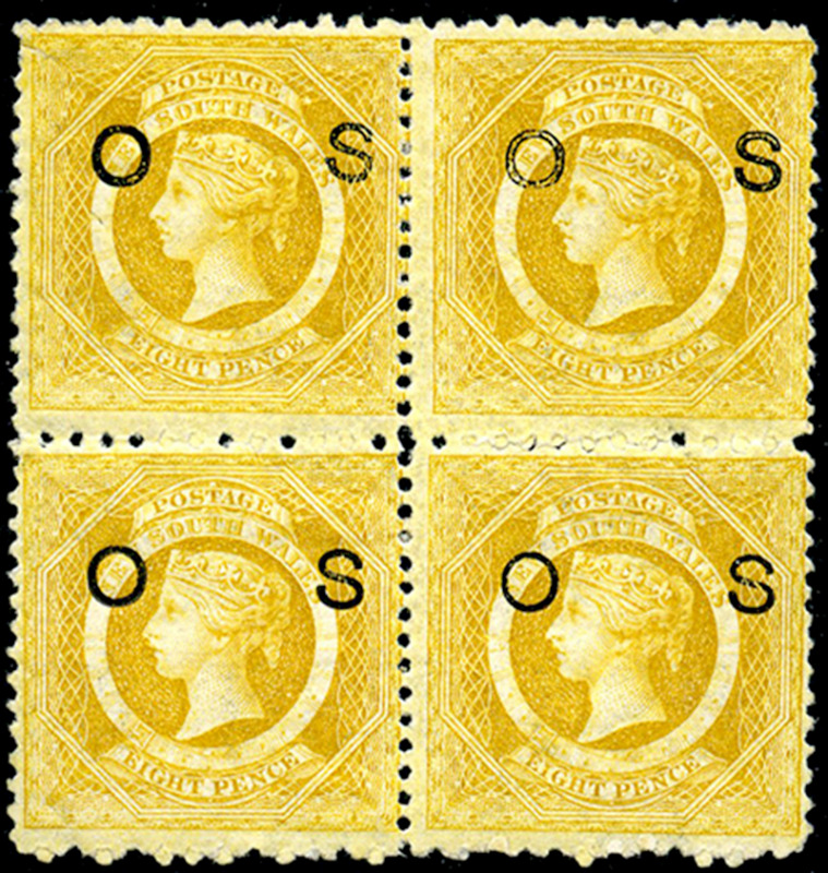 AUSTRALIAN STATES - NEW SOUTH WALES: O18: 8p yellow, perf 10x12, with OS overprint in block of four, slightly toned og otherwise fine. (SG O32 - £104) (Image)