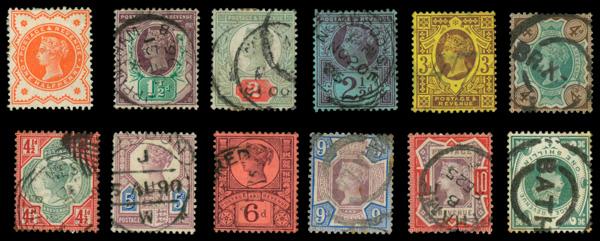 1887-92, Queen Victoria Jubilee, ½d to 1s (Scott 111-122); 3p thin & 10p pulled perf at the bottom, Fine to Very Fine. SG 197/211. Scott $275. (Image)