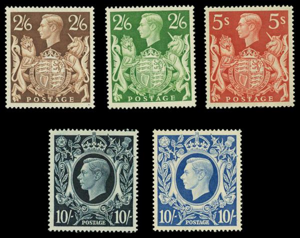 1939-42, King George VI "Square" high values, 2s6d to 10s (Scott 249-251A), o.g., never hinged, Very Fine. SG 476/8b. Scott $462. (Image)