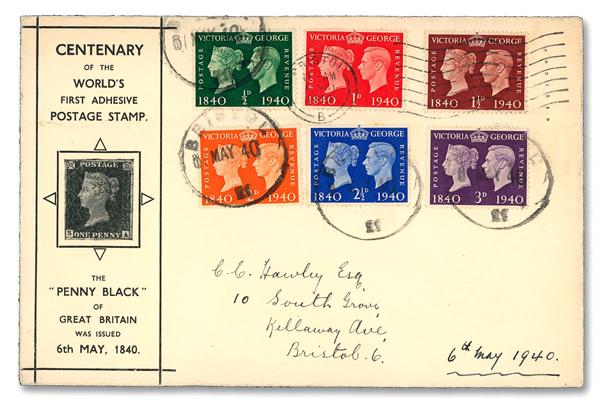 1940, Stamp Centenary complete on FDC (Scott 252-257), addressed to Bristol, Fine to Very Fine. SG 479/84. (Image)