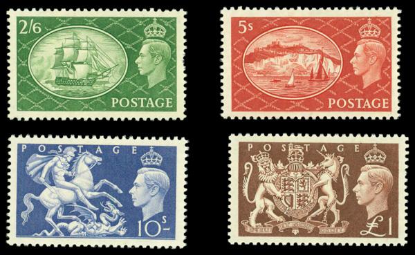 1951, King George VI "Festival" high values, 2s6d to £1 complete (Scott 286-289), o.g., never hinged; 2sh6p pulled perf at right, Very Fine. SG 509/12. Scott $80. (Image)