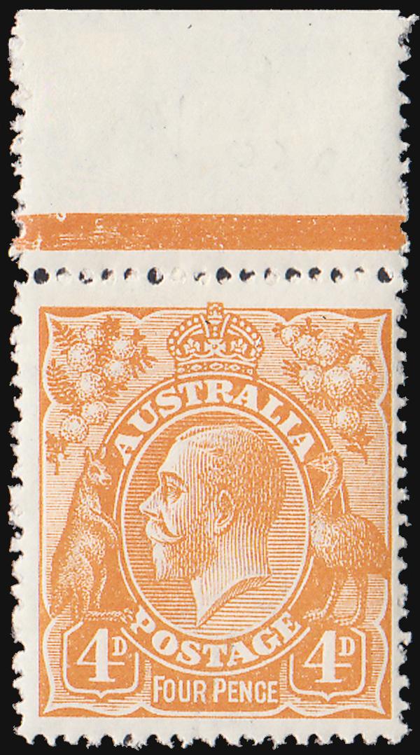1915, King George V, 4d orange (Scott 31 var.), 2nd watermark, top sheet margin single, o.g., stamp never hinged, wonderfully fresh, Fine to Very Fine. SG 22d; £42 for hinged ($50). ACSC 110H; $225 ($160). Scott $80+. (Image)