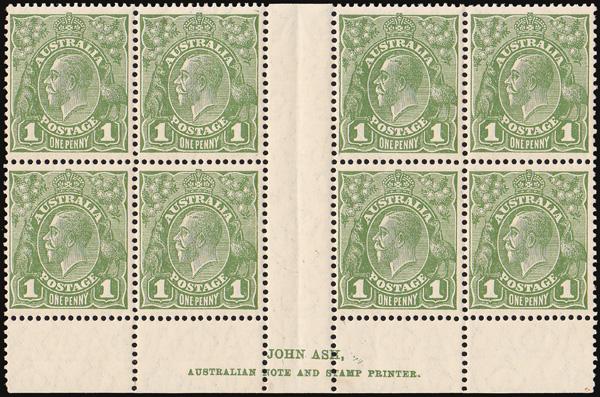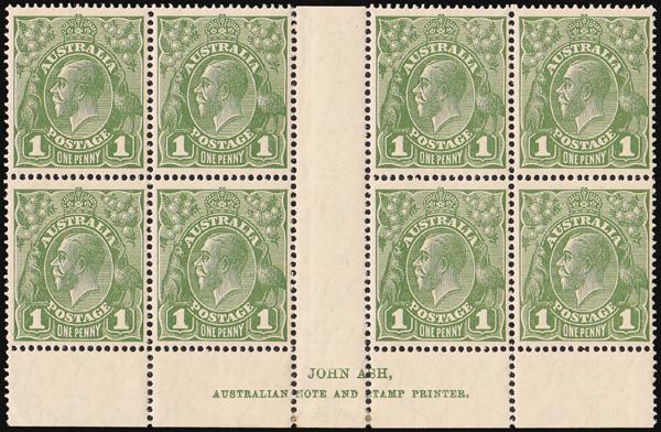 1926, King George V, 1d sage green, perf 13½x12½ (Scott 67), Small Multiple watermark, Ash 2-line imprint ("N" over "A") block of 8, o.g., barely hinged on one stamp (in imprint block of 4), Fine to Very Fine. SG 95. ACSC $185+ ($130). (Image)