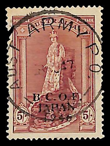 B.C.O.F., 1947, 5s claret, thick paper (Scott M7), centrally canceled by "Aust Army P.O." c.d.s. of "28 AU 47"; light age spot on reverse of top left corner, nevertheless Very Fine. SG J7; £180 ($230). Scott $200. (Image)