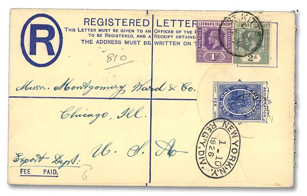 1926, registered letter entire from St. Kitts to Chicago, with New York and Chicago transit cancels, Fine to Very Fine. (Image)