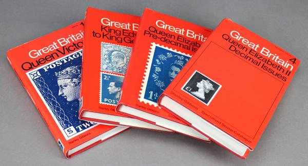 Stanley Gibbons,Great Britain Specialised, vols. 1-4, comprising Queen Victoria (vol. 1, 7th ed. (1983)), King Edward VII to King George VI (vol. 2, 6th ed. (1984)), Queen Elizabeth II Pre-decimal Issues (vol. 3, 6th ed. (1984)), and Queen Elizabeth II Decimal Issues (vol. 4, 3rd ed. (1981)); each hardbound with dustjacket and showing minimal use and shelf wear; prices outdated, but still solid detail for the British specialist. Shipping charges apply - weight 7.2 lbs. (Image)