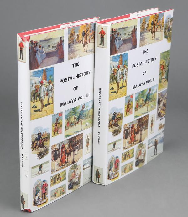 Proud, Edward B.,The Postal History of Malaya, vols. II & III (2nd ed.), 424 + 304 pp., hardcover with dust jacket, 2000; revised and enlarged editions of the 1984 first printings; Vol. II covers the Federated States of Negri Sembilan (including Sungei Ujong), Pahang, Perak, and Selangor, including FMS and Postwar periods, until independence in 1957, Vol. III the Unfederated States of Johore, Kedah, Kelantan, Perlis, and Trenggganu, until 1957; both with fully illustrated and price catalog of all known postal markings, general history, etc.; slight damage to Vol. III dust jacket. Shipping charges apply - weight 3.8 lbs. (Image)