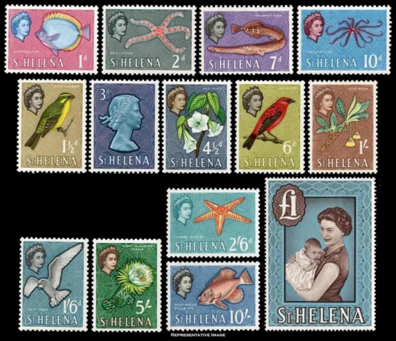 1961 Scott 159-172, 1d, 1 1/2d, 2d, 3d, 4 1/2d, 6d, 7d, 10d, 1/-, 1/16, 2/6, 5/-, 10/- and £1 QEII St. Helena Wildlife. Mint never hinged. (Inv SHL0159S1) (Image)