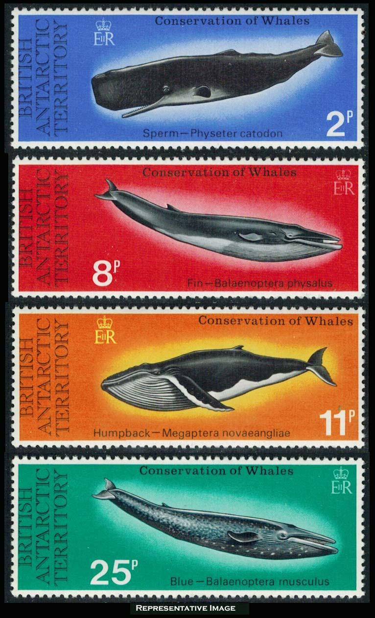 1977 Scott 64-67, 2d Sperm Whale, 8d Fin Whale, 11d Humpback Whale and 25d Blue Whale, Conservation of Whales. Mint never hinged. (Inv BAT064S1) (Image)