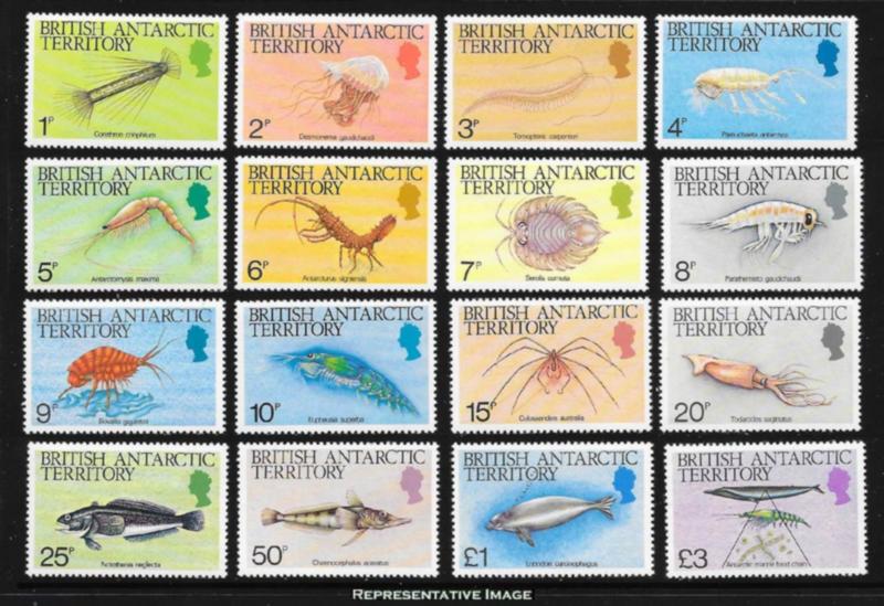 1984 Scott 102-116, 1p, 2p,3p, 4p, 5p, 6p, 7p, 8p, 9p, 10p, 15p, 20p, 25p, 50p, £1 and £3 Antarctic Marine Life. Mint never hinged. (Inv BAT102S2) (Image)