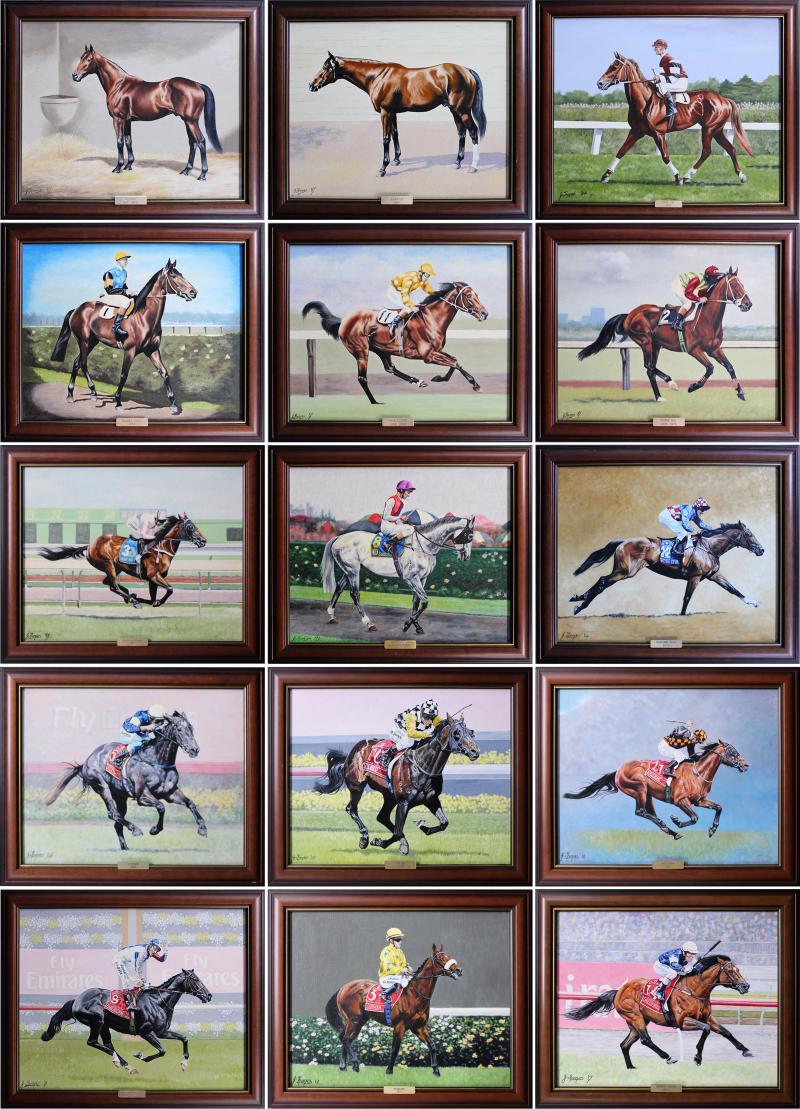 Melbourne Cup Winners Original paintings by Janet Thomas of Melbourne Cup Winners from Archer in 1861 to Green Moon in 2012, most 50x40cm, a few (Phar Lap, Makybe Diva & Americain) are a little larger. Janet Thomas was commissioned in 1981 by businessman Peter Karol to paint every winner of the Melbourne Cup since its inception. The paintings were destined for a series of Melbourne Cup Calendars, as well as a special bicentennial exhibition at Caulfield's Racing Museum in 1988, opened by Bart Cummings. For the next 30 years after the original commission, Janet would create a glorious painting of the winner, based on photographs by Bruno Cannatelli.