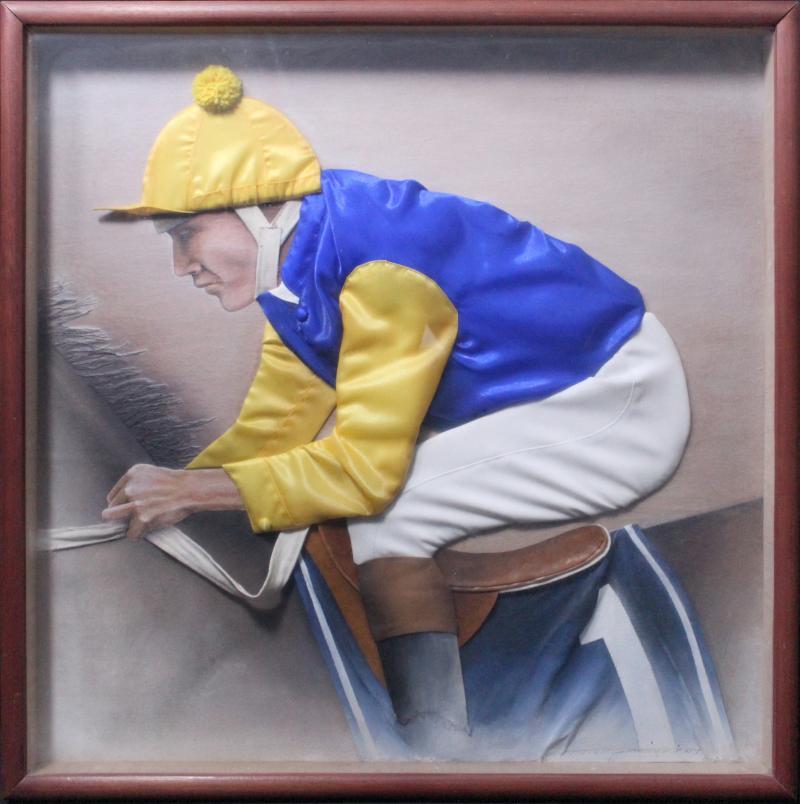 Bert Newton's Racing Colours blue with yellow sleeves & yellow cap, mounted in a 3D display with him as a jockey riding horse number 1, framed & glazed, overall 74x74cm. Believed to have been created for Newton's 50th birthday. (Image1)