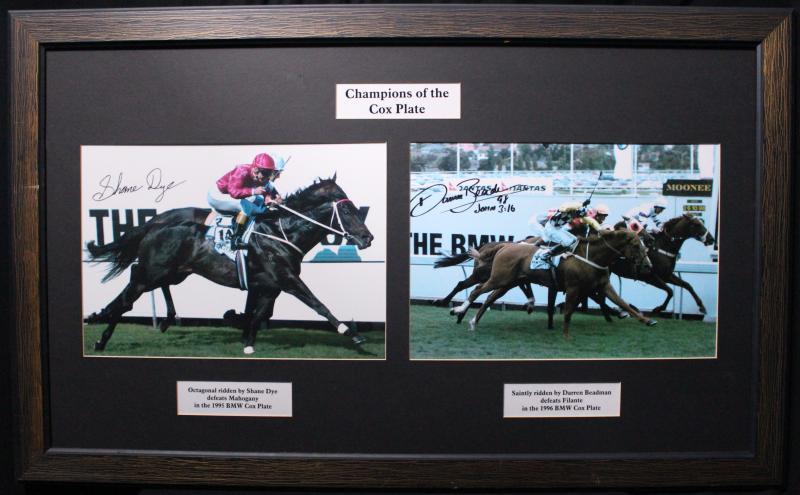 Prints Cox Plate display signed by Shane Dye & Darren Beadman; So You Think photographs signed by Steven Arnold (2 different); Phar Lap prints (2); Charles Billich horse racing prints (2), various sizes.