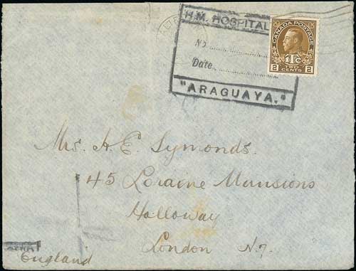 Araguaya. 1917-19 Cover and postcards of the ship (2) all posted from Halifax, Nova Scotia, the cover franked 2c + 1c War Tax stamp with boxed "H.M HOSPITAL SHIP / No - / Date - / "ARAGUAYA"", the cards franked 2c or with the stamp removed, a scarce cachet. (3). Photo on Page 90. (Image1)