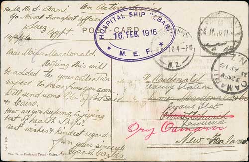 Ebani. 1916-17 Stampless O.A.S covers (2) and a postcard, the covers with London Received From H.M Ship machine or "PAQUEBOT" handstamp, the card from Port Said to New Zealand, all with violet oval dated "HOSPITAL SHIP "EBANI" / M.E.F" (the final cover with the "M" removed from the lower line), also a card of the ship. A scarce group. (4). Photo on Page 90. (Image1)