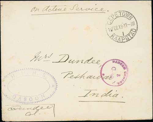 Gascon. 1918 Stampless covers to England or India with Cape Town datestamps and violet oval "H.M.H.S / GASCON". Also four cards of the ship, two with 1915 London Received From H.M Ship machine. (6). Photo on Page 90. (Image1)
