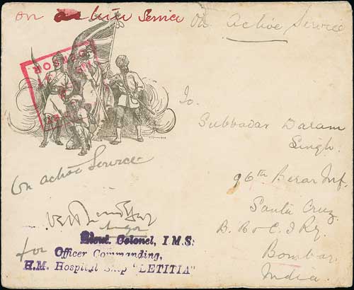 Letitia. 1915-16 Stampless O.A.S covers (3), a front and a postcard from the ship, one with violet oval "H.M. HOSPITAL SHIP / No / Date / "LETITIA"", the other four with violet "Lieut. Colonel, I.M.S / Officer Commanding / H.M. Hospital Ship "LETITIA"" (two with violet "Charles Milne" above, three with "Troops" added to the second line), four with violet "ON ACTIVE SERVICE", one cover depicting Britannia holding a Union Jack with Indian and Australian soldiers alongside. Also three cards of the ship, two written by soldiers in hospital in Bristol or Liverpool. (8). Photo on Page 90. (Image1)