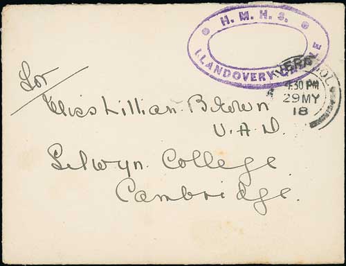 Llandovery Castle. 1918 Stampless cover (letter enclosed) with a Liverpool c.d.s and violet oval "H.M.H.S / LLANDOVERY CASTLE", also a card of the ship. (2). Photo on Page 90. (Image1)
