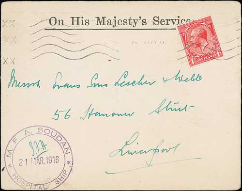 Soudan. 1916 Cover franked 1d, cancelled by naval dumb machine, with circular "M.F.A SOUDAN / 21 MAR 1916 / HOSPITAL SHIP", fine and scarce. Also four prewar cards of the ship. (5). Photo on Page 94. (Image1)