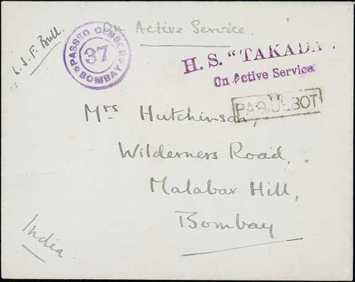 Takada. 1917-18 Stampless cover and card both with violet "H.S "TAKADA" / ON ACTIVE SERVICE", the card with Durban c.d.s, the cover to India with Bombay c.d.s and Paquebot handstamp, also two cards of the ship. (4). Photo on Page 94. (Image1)