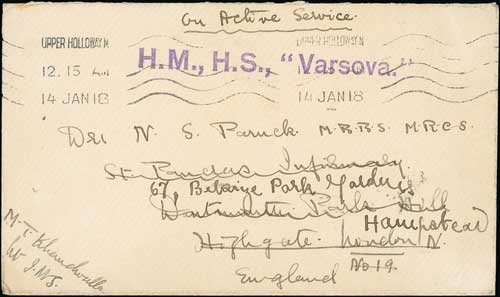 Varela/"Varsova". 1916-17 Stampless O.A.S covers with Bombay datestamps and violet "ON ACTIVE SERVICE / H.M.H.S "VARELA"" or "H.M., H.S., "VARSOVA."", also a card of the "Varela", the first with opening tears, otherwise both fine and scarce. (3). Photo on Page 94. (Image1)