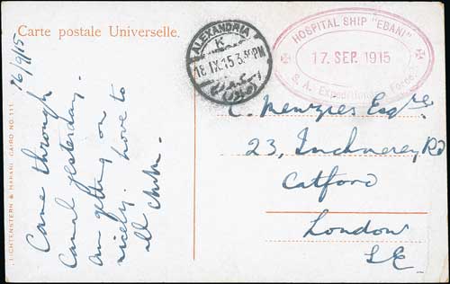 South Africa - "Ebani". 1915 Stampless postcard with red oval "HOSPITAL SHIP "EBANI" / 17 SEP 1915 / S.A Expeditionary Force" and Alexandria c.d.s, fine and scarce. Also a card of the ship at Cape Town. (2). Photo on Page 96. (Image1)