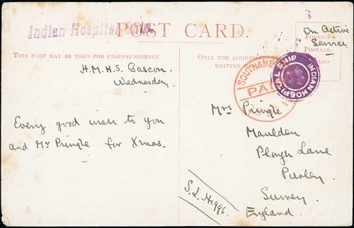 Gascon. 1915 Stampless picture postcards of the ship, both with Southampton Paid c.d.s and circular intaglio "INDIAN HOSPITAL SHIP" seal type handstamp in violet, one also with straight line "Indian Hospital Ship", fine and scarce. (2). Photo on Page 96. (Image1)