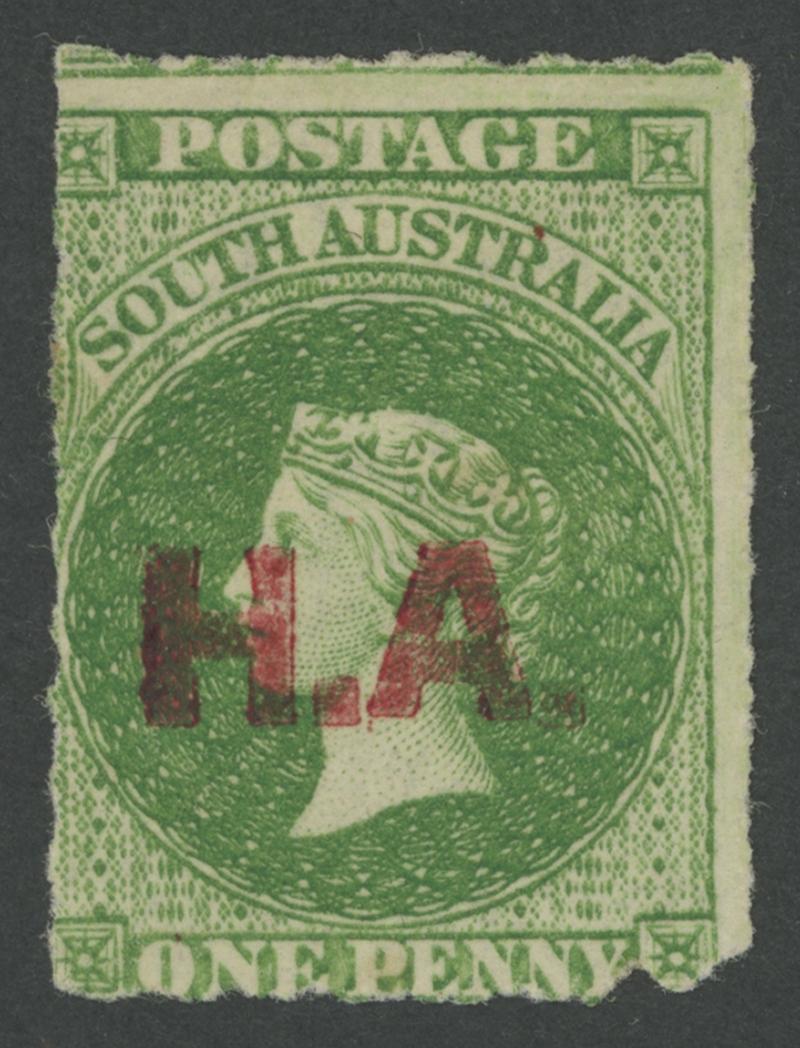 RED OVERPRINT: 'H.A.' on QV Perkins Bacon Large Star Wmk Rouletted 1d bright yellow-green SG DO259, rouletting on all sides, small separation faults at lower-right, large-part gum, Cat £750. Rated RRRR. Ex William Frazer and Robert Jenkins: sold for $610 (Sale 127 Lot 2517). Chris Ceremuga Certificate (2019) states "extremely rare". The mint Vestey and 'Besancon' examples sold for £575 and SFr785 respectively. Absent from Don Pearce's collection. (Image1)