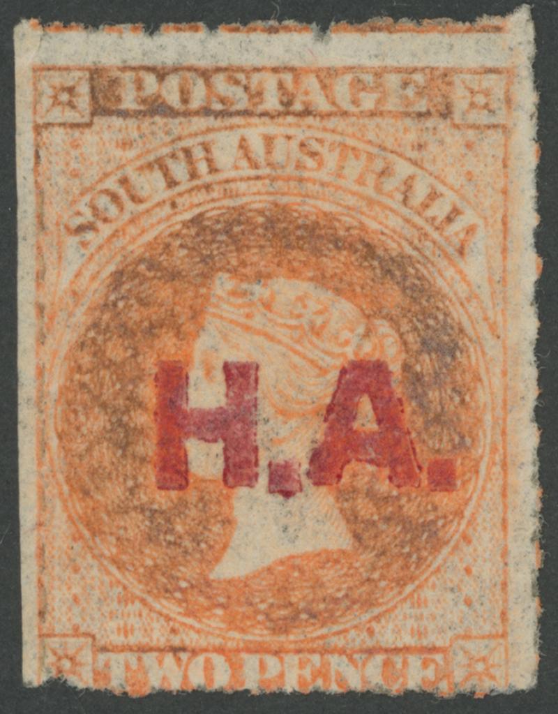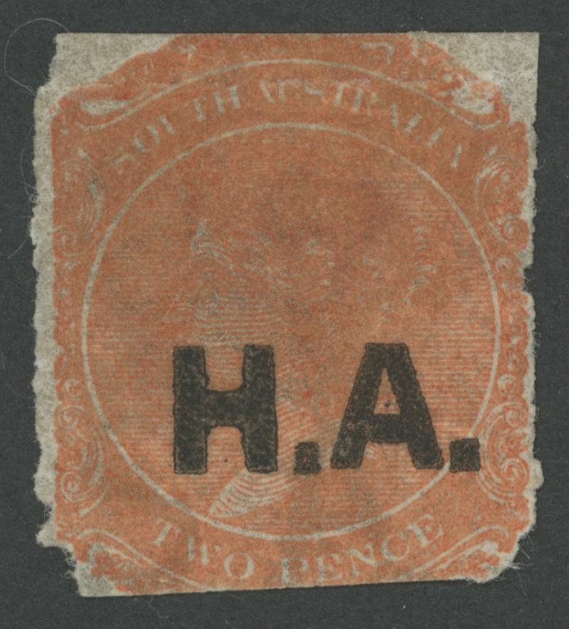 BLACK OVERPRINT: 'H.A.' on QV De La Rue Crown/SA Wmk Rouletted 2d deep brown-orange SG DO264, rouletting at the sides and cut from the sheet a little into the design at top & base, minor separation faults at lower corners, large-part gum, unpriced unused by Gibbons. Unrecorded unused by Ron Butler and the only recorded example so it should be rated RRRRRR. Ex 'Besancon': sold for SFr605. Chris Ceremuga Certificate (2018) states "Great rarity...original gum". Absent from Don Pearce's collection.