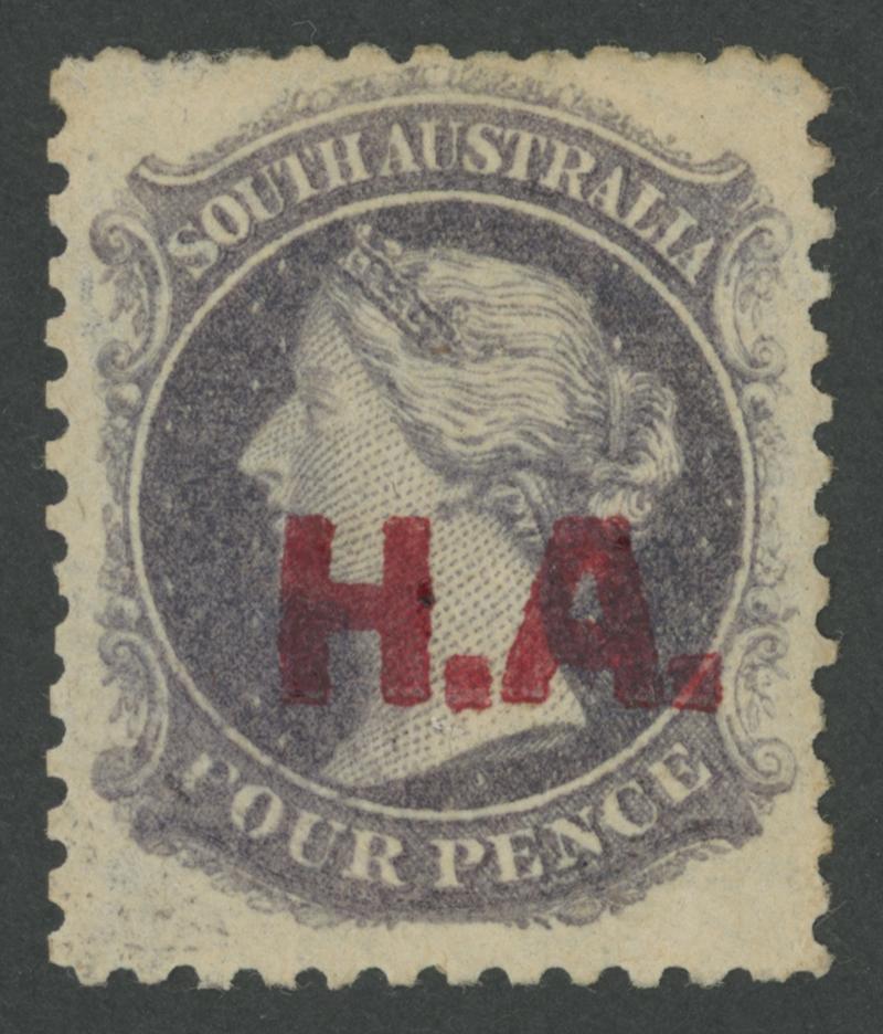 RED OVERPRINT: 'H.A.' on QV Perkins Bacon Large Star Wmk Perf 11½-12½ 4d deep violet SG DO263, well-centred, large-part gum, Cat £350. Rated RRR. Superior to the Vestey - perfs into the design - and 'Besancon' - straight-edge at left - examples that sold for £336 and SFr290 respectively. Absent from Don Pearce's collection. (Image1)