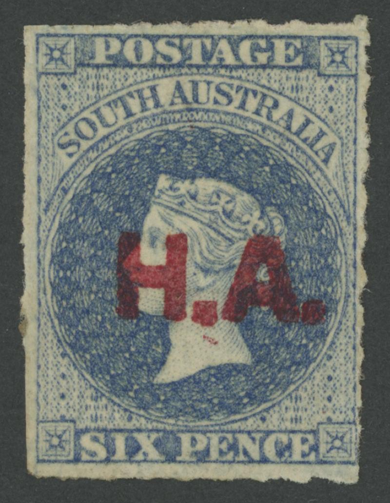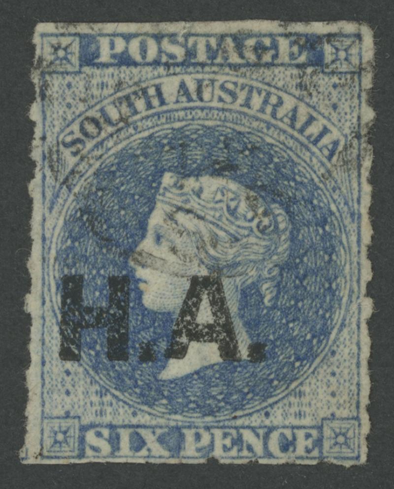 BLACK OVERPRINT: 'H.A.' on QV Perkins Bacon Large Star Wmk Perf 11½-12½ 6d Prussian blue SG 269, some irregular perfs at the sides, indistinct cancel, Cat £275. Rated RRRR; unrecorded unused. Ex 'Sir Humphrey' (Brian Farmer): sold for $303 (Sale 118 Lot 386). Don Pearce's similar example sold for $455 (Sale 247 Lot 395). [Date range 25.6.1870 to 17.6.1874] (Image1)