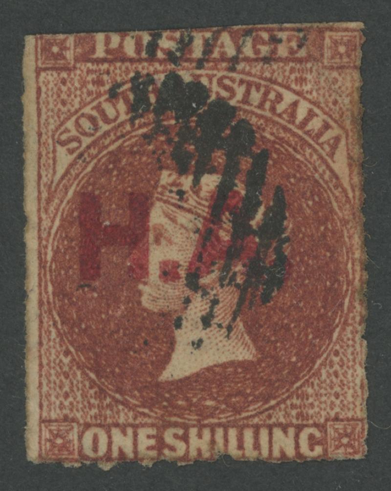 RED OVERPRINT: 'H.A.' on QV Perkins Bacon Large Star Wmk Rouletted 1/- bright red-brown SG DO262, rouletting except at top where cut from the sheet to largely preserve the design, a little aged, untidy GPO circle-in-bars cancel, Cat £160. Rated RR. Don Pearce's very fine example sold for $287 (Sale 247 Lot 385). [Date range 4.6.1868 to 8.1.1869] (Image1)