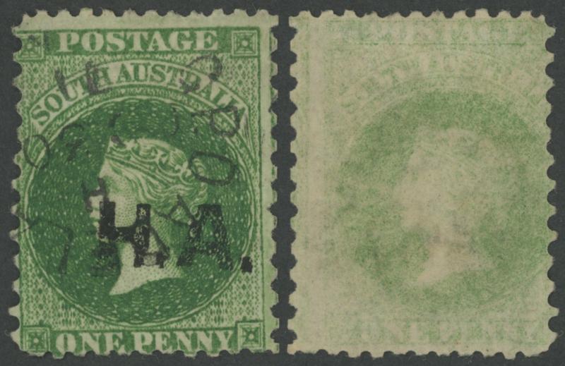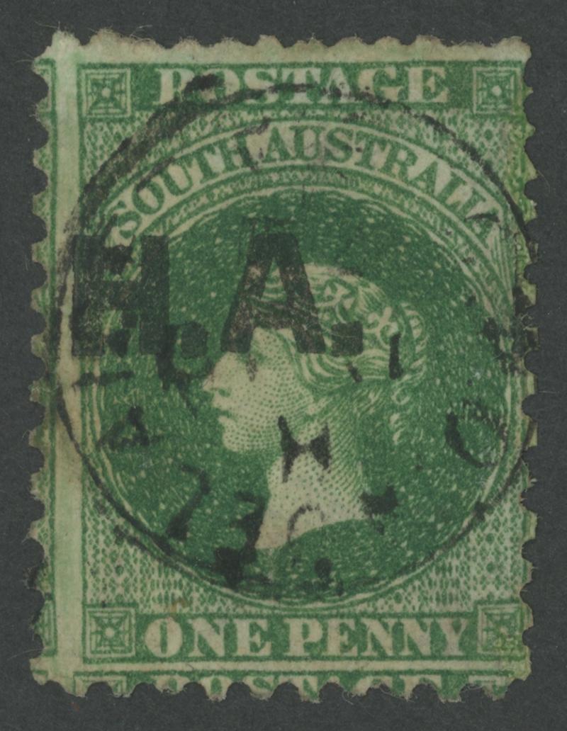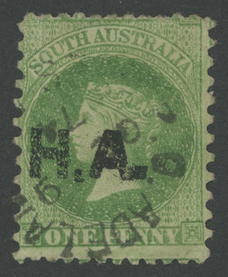 BLACK OVERPRINT: 'H.A.' on QV Perkins Bacon Large Star Wmk Irregular Compound Perf 11½-12½x11½-12½x10x11½-12½ 1d green SG 274 with the Overprint Misplaced to Left, a couple of minor defects, GPO cds with indistinct date, Cat £500. Rated RRR. Ex Don Pearce: sold for $287 (Sale 247 Lot 389). [Date range 26.6.1874 to 6.11.1874] (Image1)