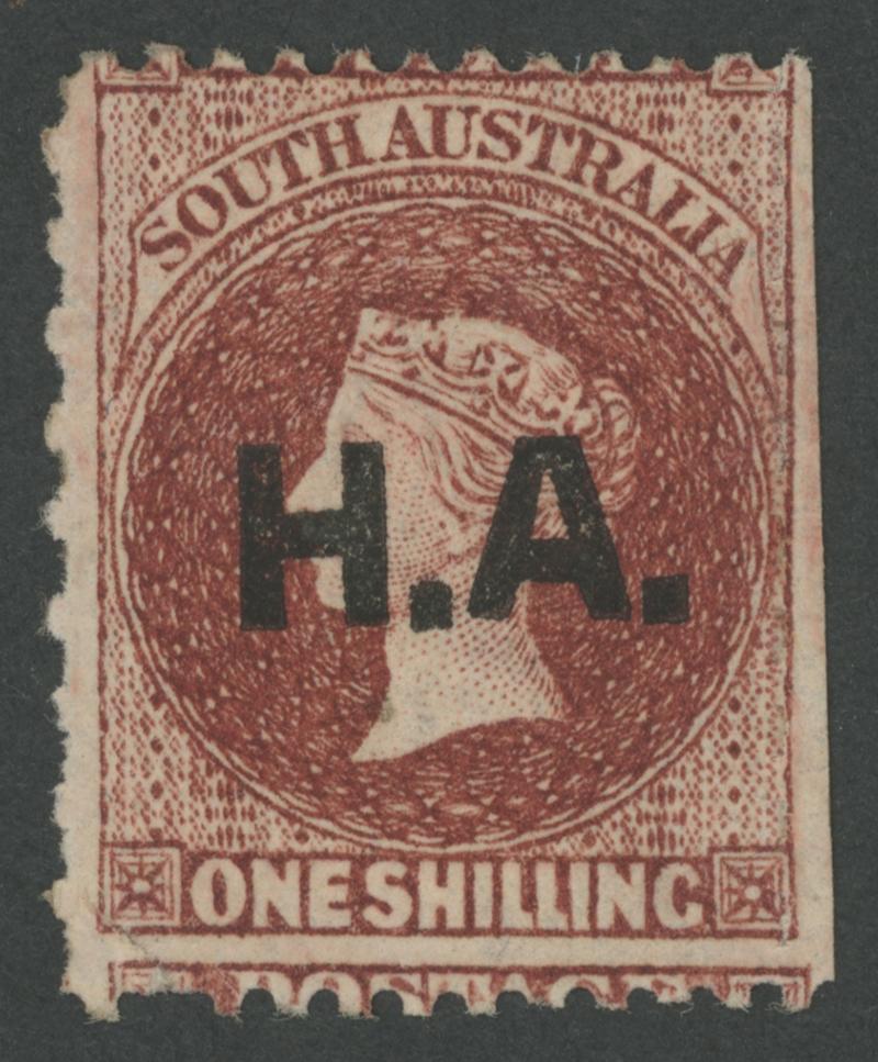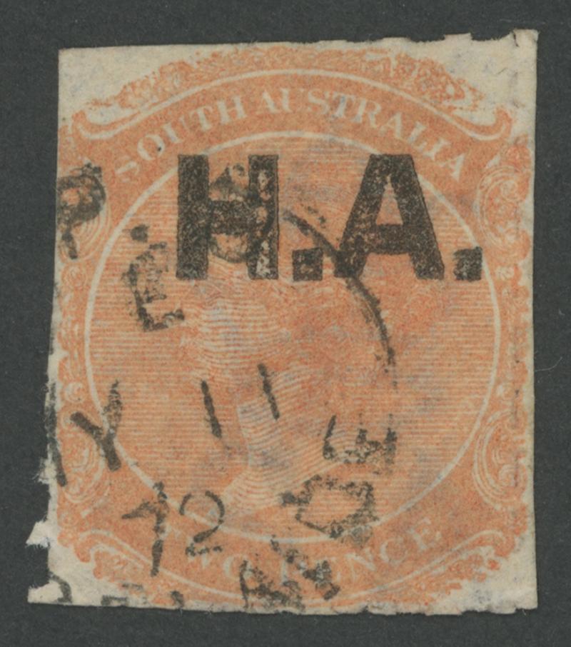 BLACK OVERPRINT: 'H.A.' on QV De La Rue Crown/SA Wmk Rouletted 2d deep brown-orange SG DO264, rouletting on all sides but with some trimmed roulettes, fine GPO cds of 'MY11/72', Cat £850. Rated RR. Don Pearce's very fine example sold for $1495 (Sale 247 Lot 390), suggesting it is significantly underrated. [Date range 11.5.1872 to 12.9.1872 only] (Image1)