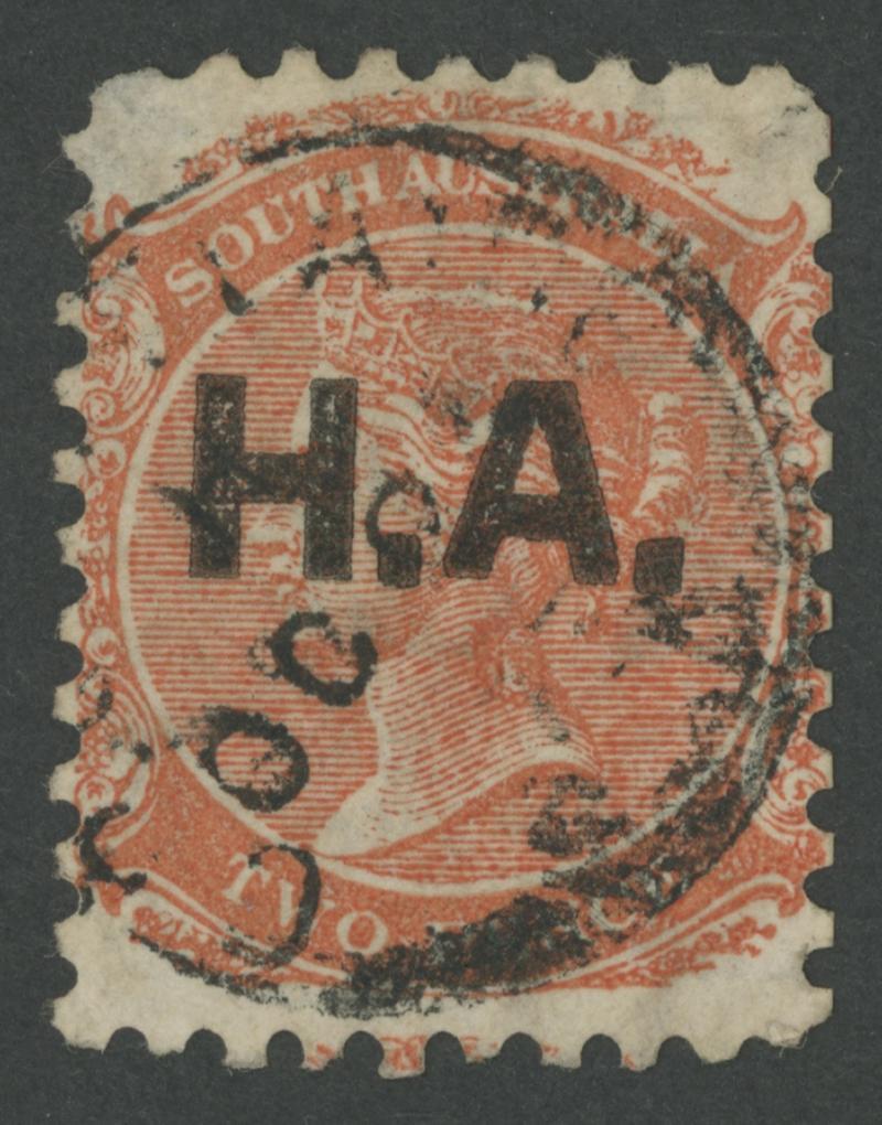 BLACK OVERPRINT: 'H.A.' on QV De La Rue Crown/SA Wmk Perf 10 2d red-orange SG DO272, well-centred, GPO cds of 'OC27/73', Cat £130. Rated RR; unrecorded unused. Superior to Don Pearce's example - a few short perfs - that sold for $228 (Sale 247 Lot 391). [Date range 27.10.1873 to -.6.1874 only] (Image1)