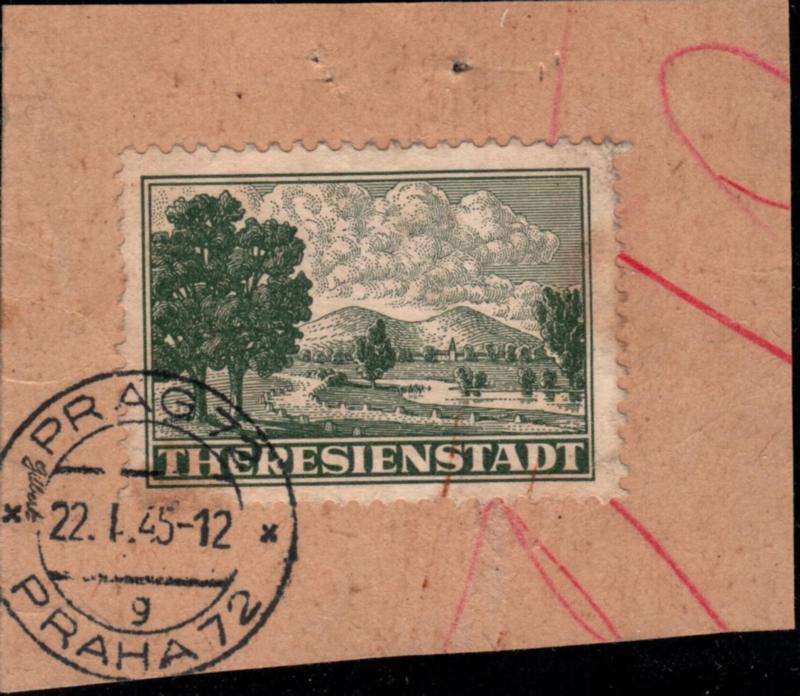 1943 Pof.Pr1A, THEREIENSTADT Admission stamp on piece, perforation 10½, cancelled ‘PRAG 22.I.45’; Cert. signature at margins. MiNr: 1, 500€. (Image)