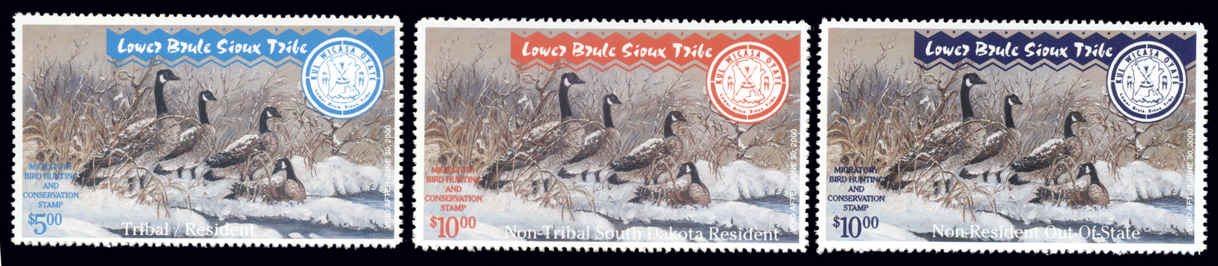 LB41-43,1999 Lower Brule Sioux Tribe (South Dakota), Set of 3, multi-color picturing Canada Geese, $5 Tribal, $10 Non-Tribal South Dakota Resident, and $10 Non-Resident out of state, VF NH Cat($34) (Image)
